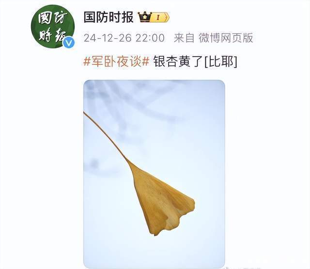 我国军迷网友应该对这张照片并不陌生。去年12月成飞的新型战机试飞后,《国防时报》就曾在社交媒体上发布了一张银杏叶的照片,并附文称“银杏黄了,它真的好像一片叶子”,被网友解读为《国防时报》是在用“银杏叶”暗示成飞的新型战机。